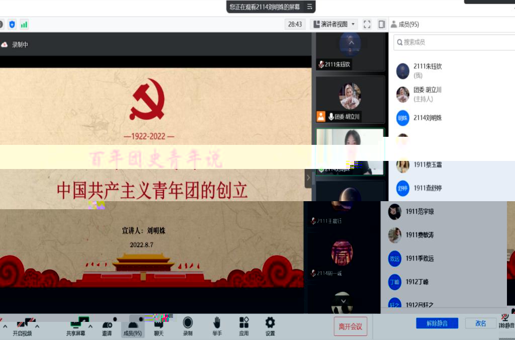 為進一步加強團史學習教育,促進黨員、團員之間相互交流,相互學習,以更加昂揚的姿态肩負時代使命。8月7日晚,利记SBOBET官网APP團委組織開展“百年團史青年說”主題信仰公開課,宣講團成員由2020、2021級團支部書記以及暑期社會實踐隊代表組成,2019級、2020級、2021級同學參加了本次的宣講活動。